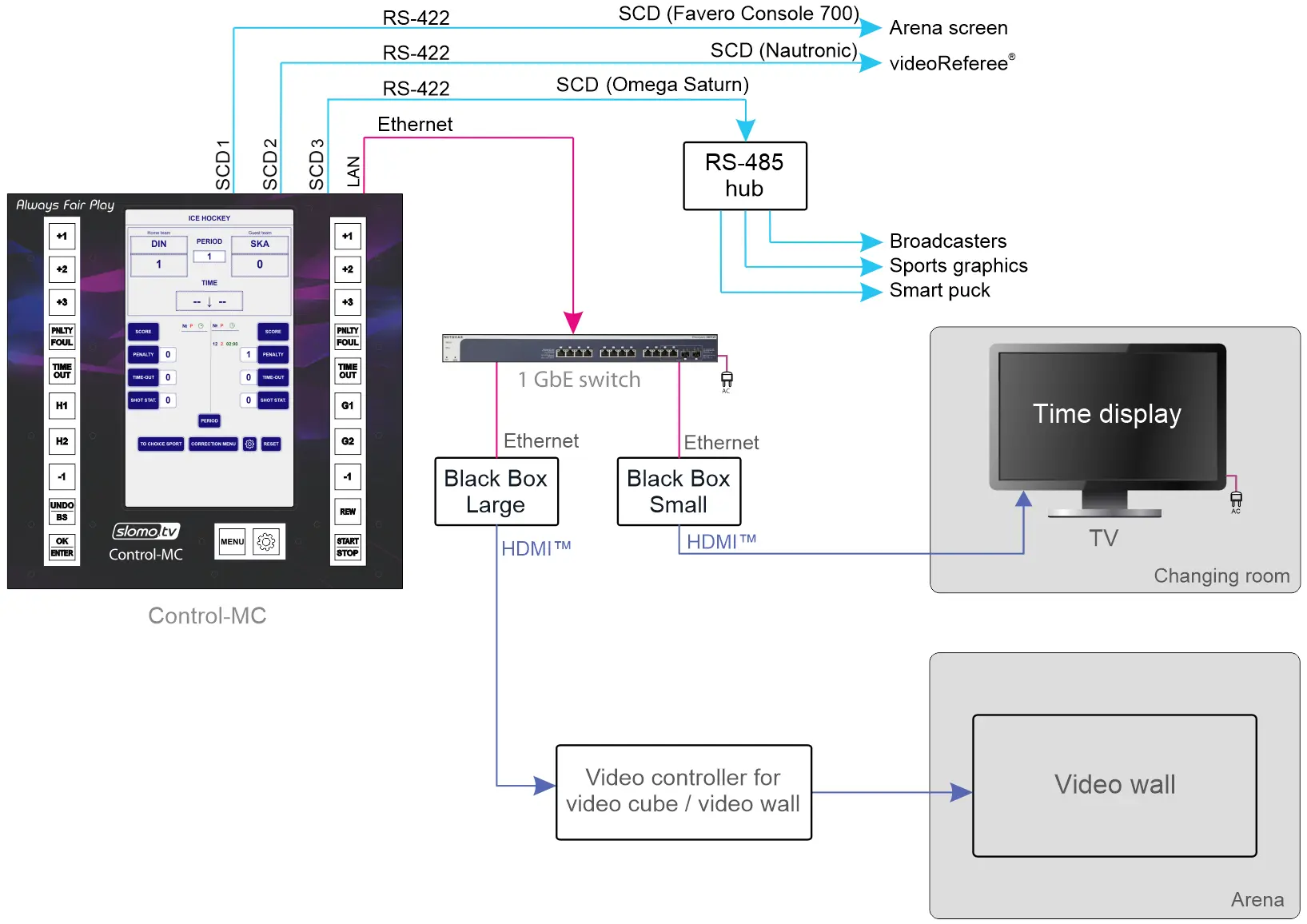 Матч-контроллер должен иметь достаточное количество портов для подключения систем арены и всего периферийного оборудования. Control-MC оснащён портами Smart I/O, которые используются для прямого подключения всех пультов управления и индикации, применяемых в различных видах спорта. Мы также предлагаем расширитель портов BOB (break-out box), который подключается к одному порту Smart I/O и позволяет подключить к нему до семи устройств.
