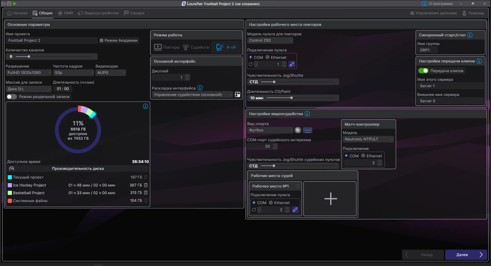 - Два полностью независимых рабочих места – для оператора повторов и VAR / видеосудьи, каждое с 1 монитором.